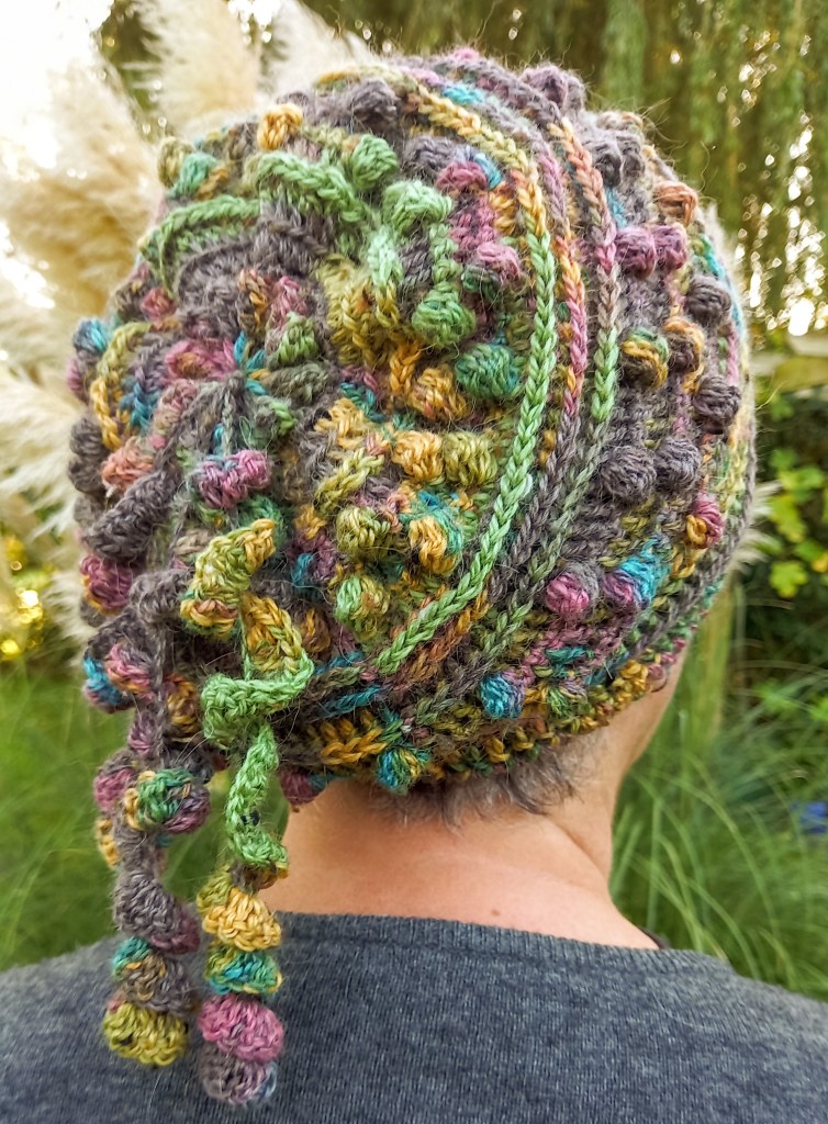 Introducing my latest pattern – a slouch hat in dk yarn with lots of texture and whimsical tails. I’m currently working on some big projects, so this was a pleasure to make as a change from those. It seems to have come at the right time too, just as the weather here definitely shifts towards autumn. Pattern is in LoveCrafts and on Etsy, and find it in Ravelry