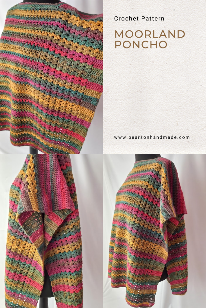I have so many works in progress (WIPs) that I was determined to get one finished, and here it is: the Moorland Poncho. I’ve worked it in Hayfield Spirit DK, a lovely variegated yarn that created the stripes you see here. The pattern is largely based around treble crochet (US double crochet), either worked ‘as standard’, grouped into V-stitches, or worked together to create triangles. It is a two-row repeat, so you quickly become familiar with the pattern and I found it quite relaxing. I have a tendency to over-complicate things, so I’m making a real effort this year to keep patterns a little simpler, while still including enough detail to be interesting. This poncho is made of two panels, joined at the shoulders. Pattern is available on Etsy, Lovecrafts and on Ravelry