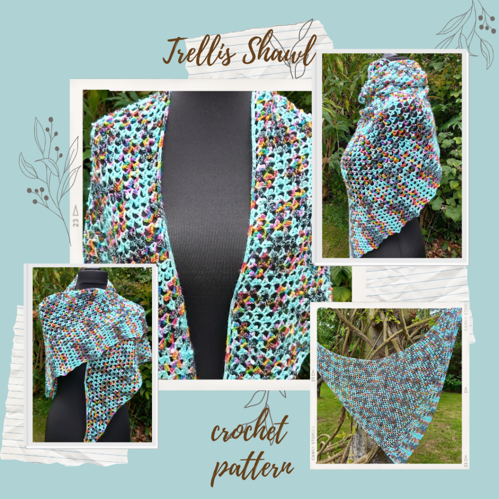 Since visiting the Wool Monty Show earlier in the year, I’m really trying to work with UK indie yarn more in my projects. It’s possible to make some lovely bags and cowls with one skein of such yarn, but I bought quite a lot of two skeins of sock yarn at the show, and that has opened up a whole range of ideas. This is my latest design, the Trellis Shawl, using two skeins of sock yarn from Cuddlebums, based in Halifax. I’ve also worked the pattern up, successfully, in a left-over half a Scheepjes Whirl with matching Whirlette. I loved making it so much, I’m now weighing up my 4ply/fingering/sock yarn stash to see what else I can make it with! Pattern can be found on Ravelry, Etsy and LoveCrafts.