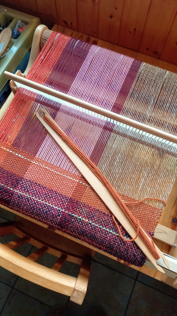 I weave on a rigid heddle loom, and once I’ve chosen the yarn for my warp, my next decision is the size/dent of the reed. I have a bamboo blind, cut to size, on the back beam, so that when I wind on the warp, the yarn spreads evenly. The warp has a huge impact on the finished fabric, so it’s worth taking your time here.
