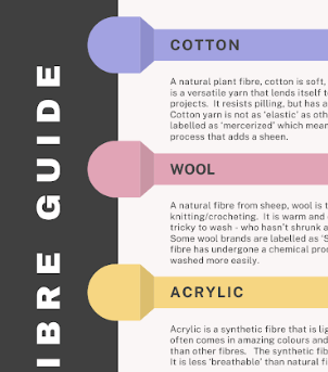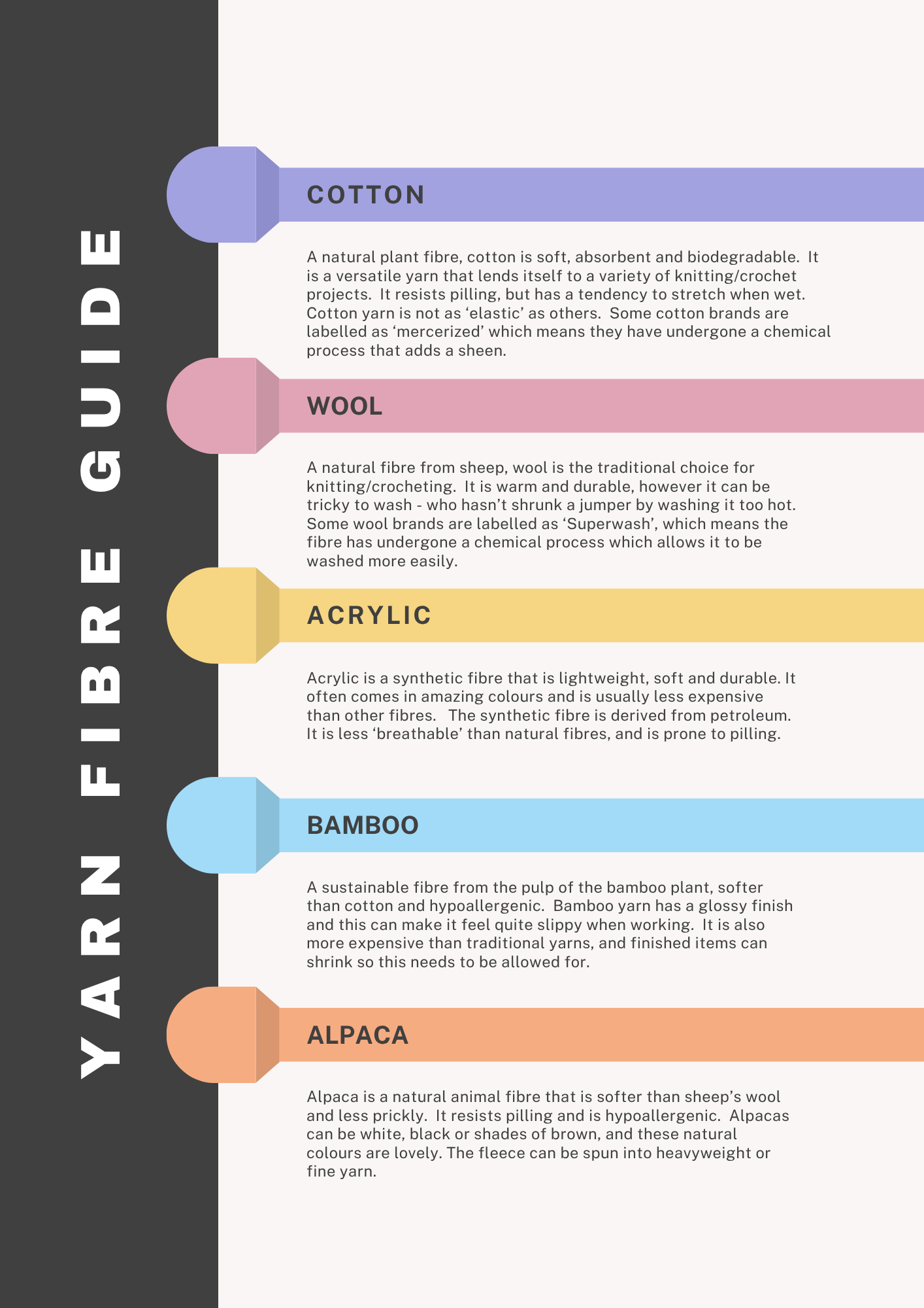 Do you find yourself confused about all the different fibres that are available? I’ve created an A4 guide that explains the properties of 5 common yarns to help you decide what to use.
