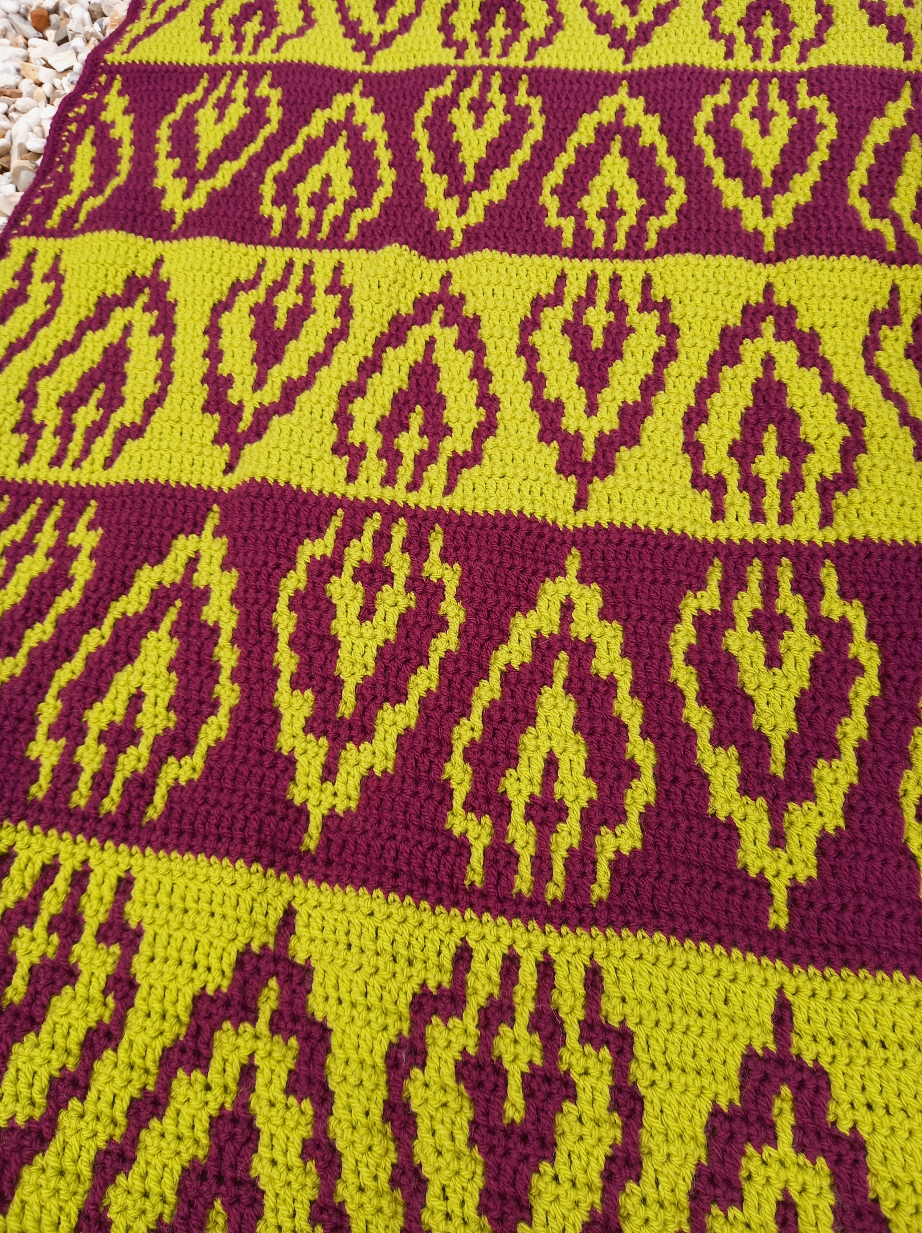 Images below show: Freeform crochet; a round mandala; a mochila bag in progress; textured crochet in progress; tunisian crochet on a hook; a finished beaded crochet necklace; a mosaic crochet blanket.