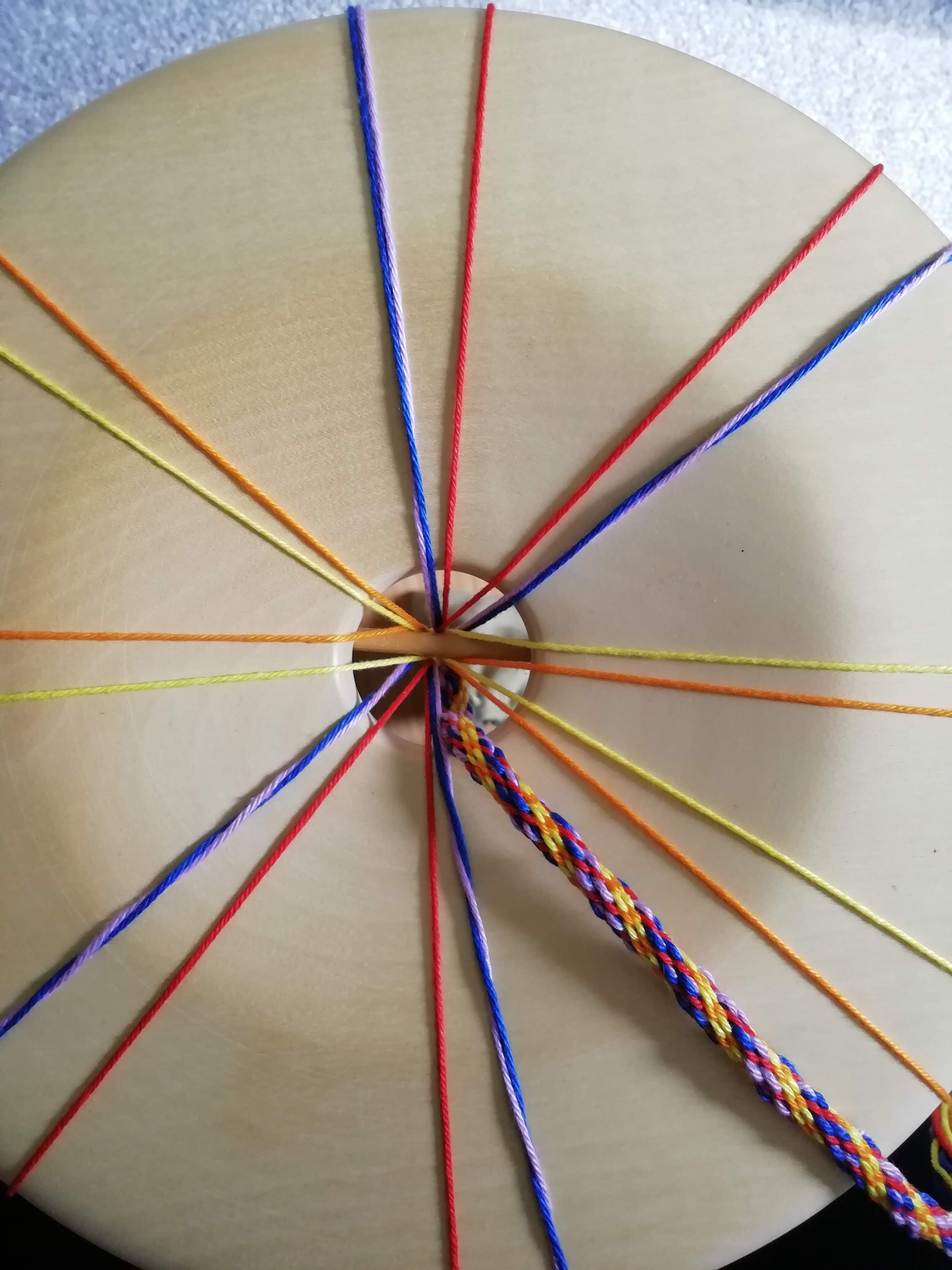 Images below (from left to right): A kumihimo braid in progress on a marudai; a woven strap in progress on an inkle loom; an assortment of braids and tassels.